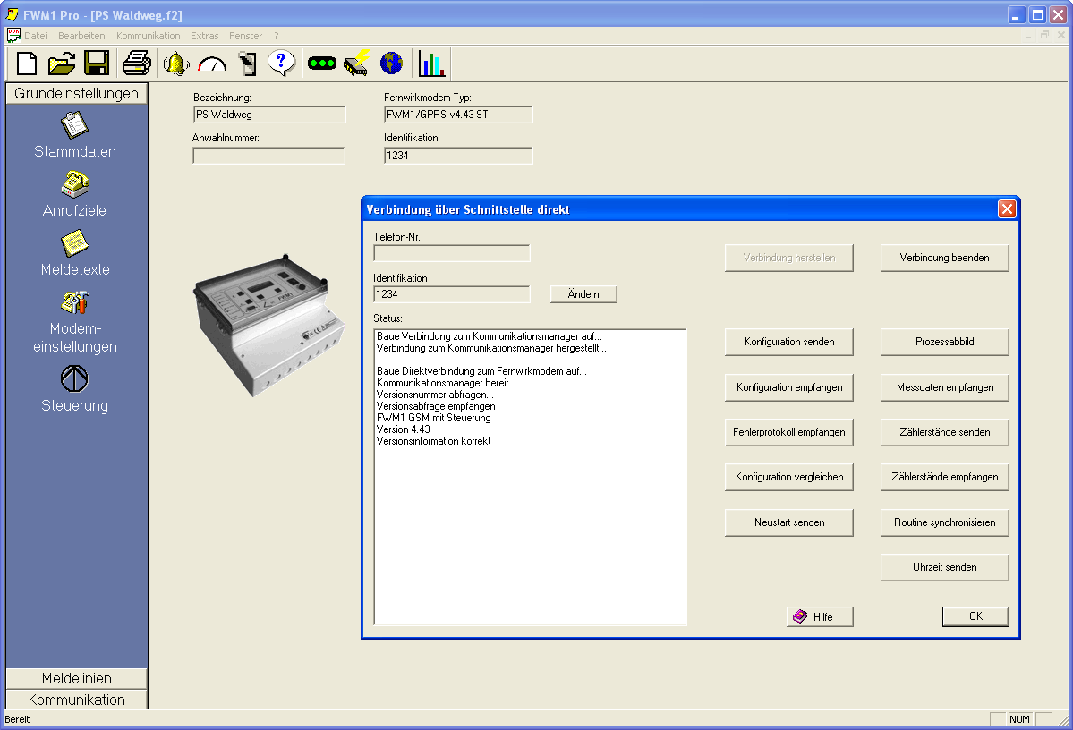 Die Konfiguration der Fernwirkendgeräte FWM1 erfolgt über eine zum Lieferumfang der Geräte gehörende, kostenlose Software. Dabei kann die Parametrierung der Endgeräte über eine direkte Verbindung (Konfigurationskabel), Modemverbindung (analoges Modem) oder eine Internetverbindung (zu Endgeräten, die über GPRS angekoppelt sind) vorgenommen werden.